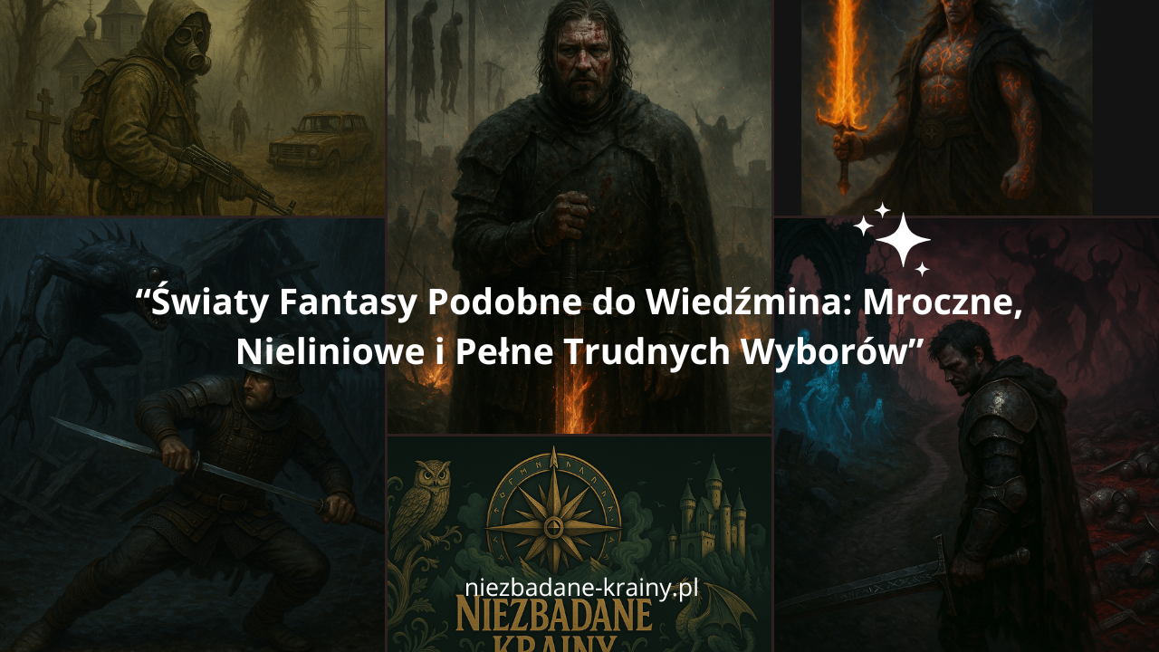 Witaj na pokładzie, miłośniku Niezbadanych Krain (Hoho! Cóż za wyborna gra słów)! Z pewnością wiesz, że świat Wiedźmina to unikatowe połączenie słowiańskich mitów, mrocznego realizmu i moralnie niejednoznacznych wyborów. Ale czy istnieją inne uniwersa, które potrafią dostarczyć podobnych wrażeń? Oczywiście, że tak! Przygotowałem dla Ciebie zestawienie światów fantasy, które w różnym stopniu nawiązują do klimatu stworzonego przez Andrzeja Sapkowskiego. Znajdziesz tu zarówno mroczne realia, jak i nieliniowe fabuły pełne trudnych decyzji, a także propozycje książek, gier i filmów, które pozwolą Ci zanurzyć się w nich jeszcze głębiej. Gotowy! Hop przez portal...